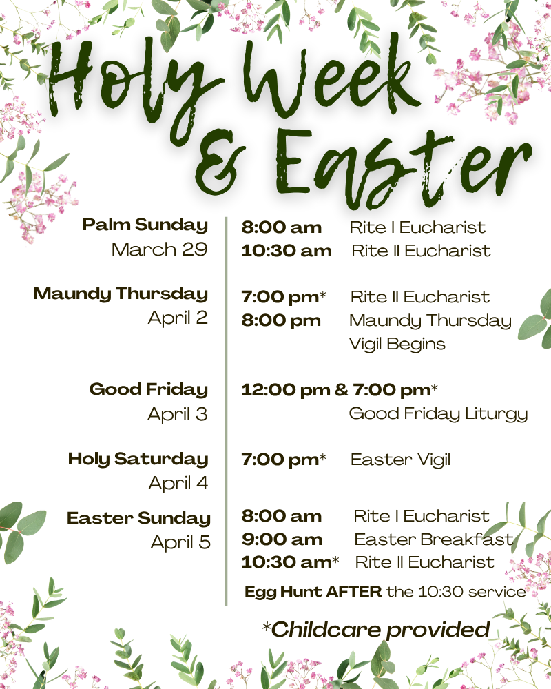 We also have two services on Sundays: a meditative Rite I service at 8:00 am and a traditional Rite II service with organ music and choir at 10:30am.
